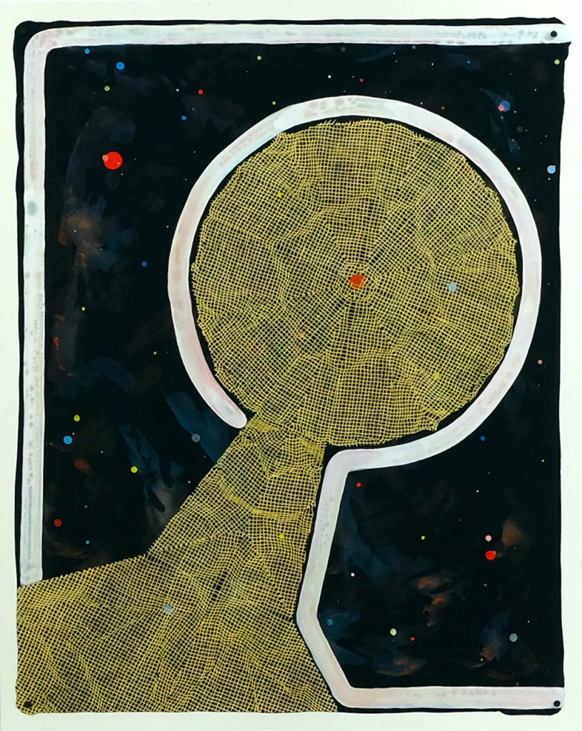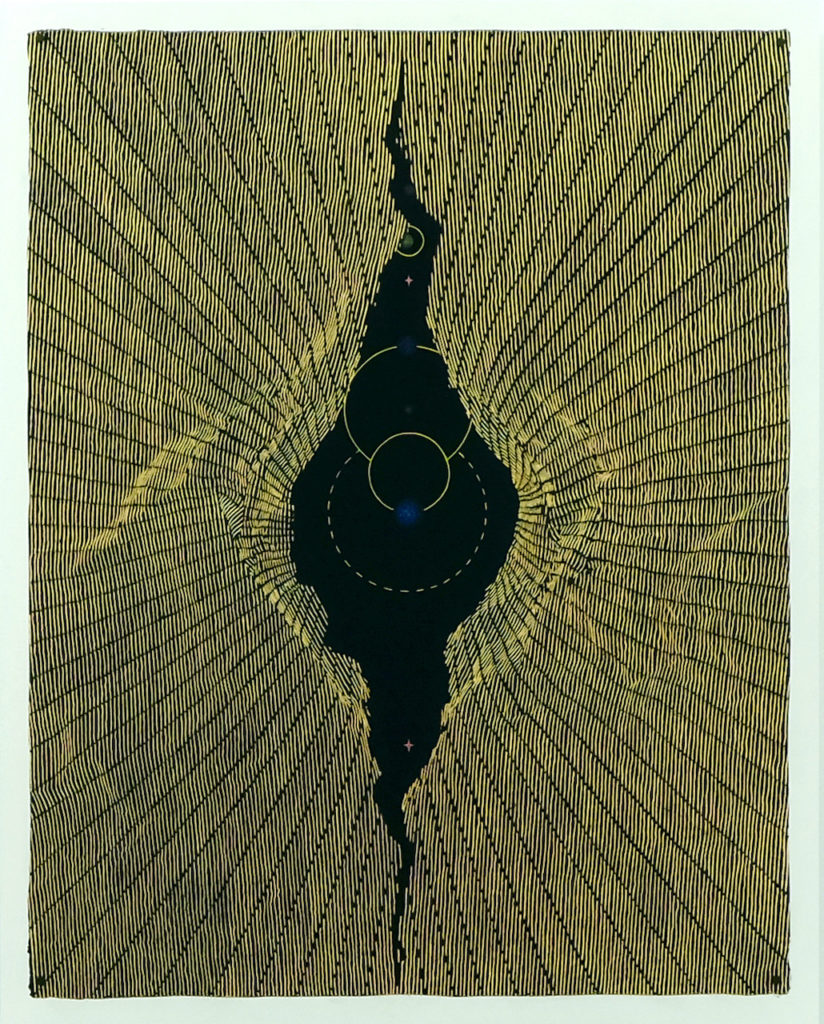 La couleur, la vibration des lignes et des formes, la dimension abstraite et optique composent des architectures sensibles et structurées à partir du nombre d’or. Cosmogonies actuelles, imaginaires célestes et mystiques, ses dessins convoquent des symboliques très fortes à partir de formes primaires qui se télescopent.